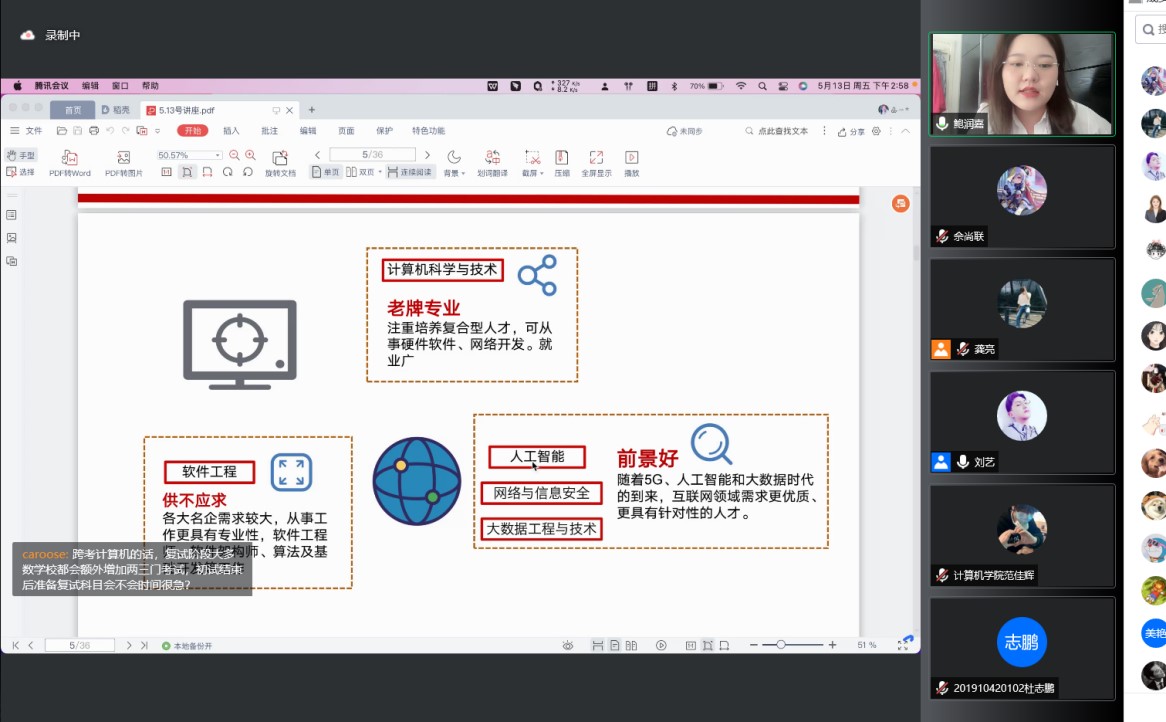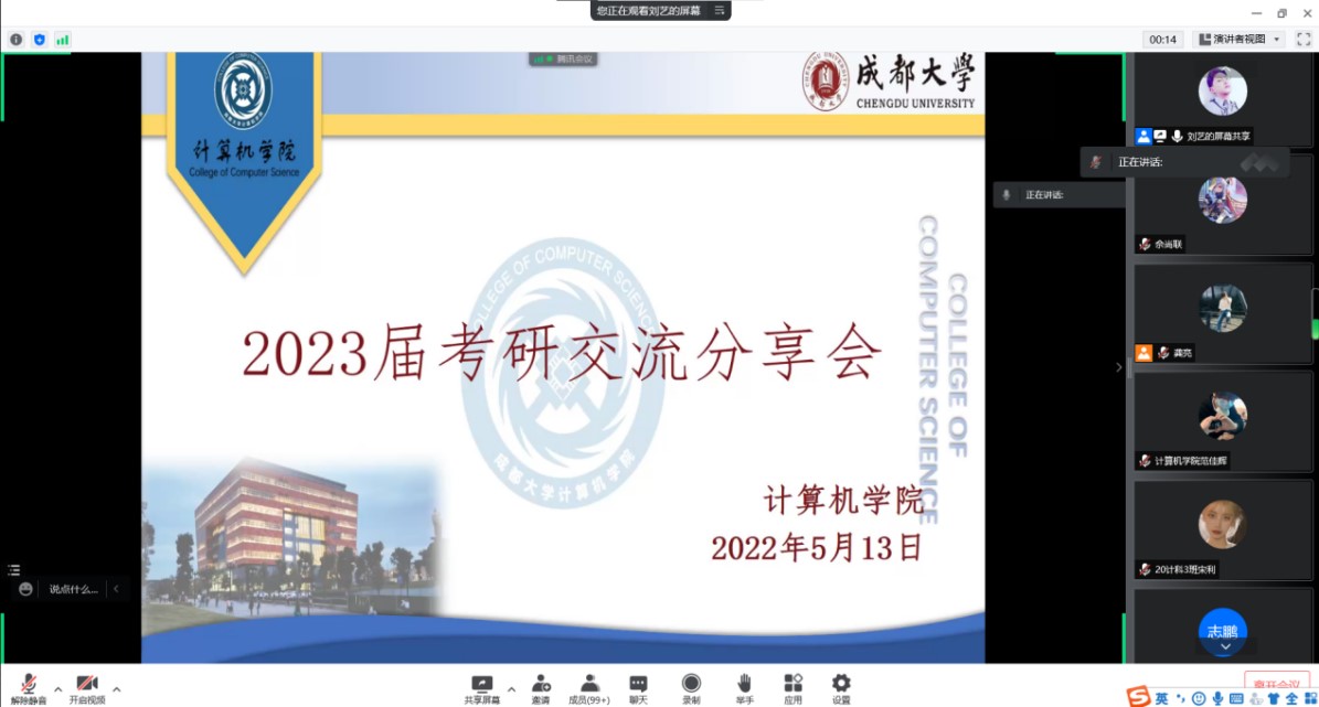 本网消息 (文/ 佘尚联)为提高同学们的考研热情,确立同学们的考研目标,解决考研同学的疑问,激发同学们向学之心,513日下午,计算机学院以腾讯会议线上交流的形式开展了2022年考研交流分享会。本次活动特别邀请了2022年成功考取四川大学、云南大学、美国波士顿大学、西南交通大学、西南大学的五位优秀学长和来自中公考研的老师来交流分享,给同学们答疑解惑,分享考研经验、指点迷津。