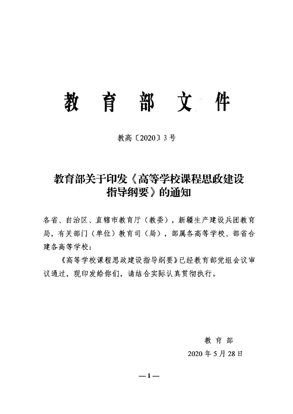 教育部于2020年5月发布《高等学校课程思政建设纲要》,为高校所有教师、所有课程开展课程思政建设提供了基本规范,全面界定了课程思政的内涵、意义、目标、主线、重点、体系、方式及保障等问题。